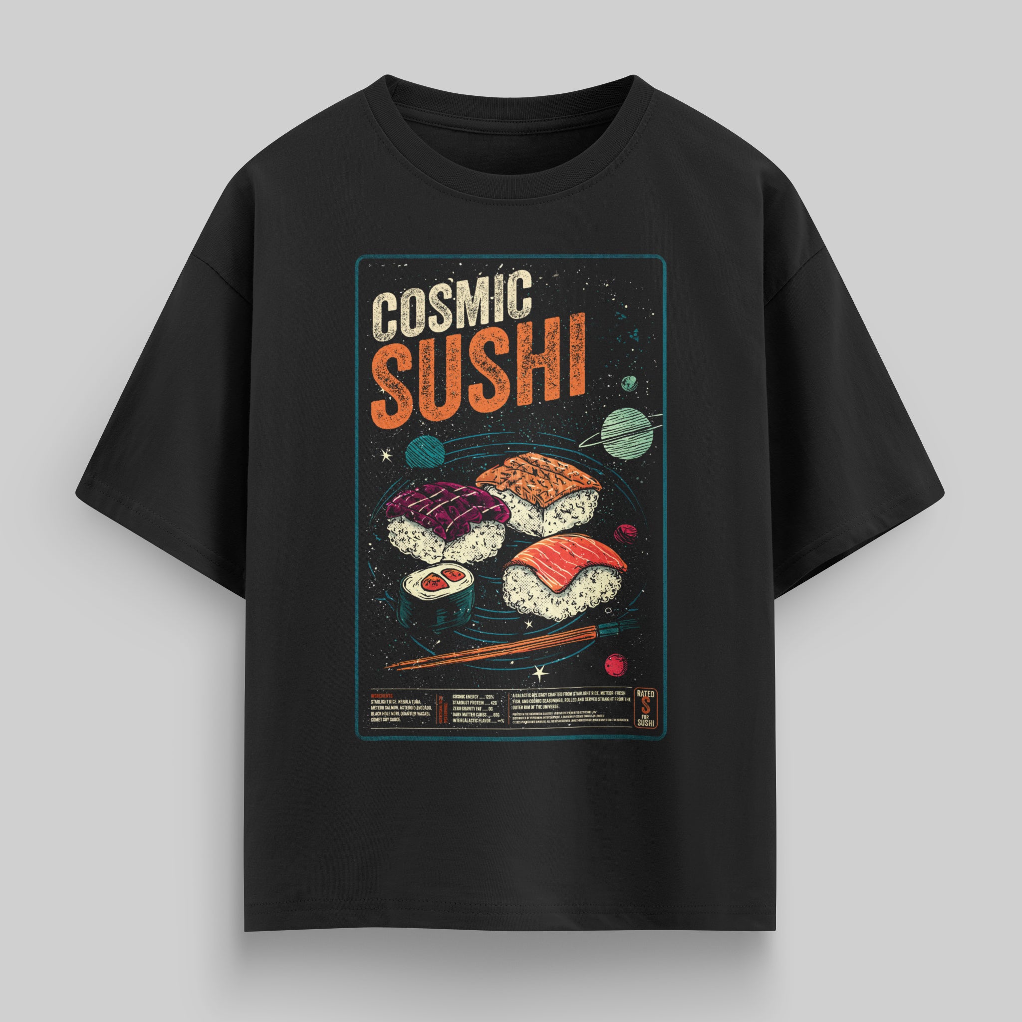 Cosmic Sushi takes your taste buds light-years ahead—where sashimi orbits planets and soy sauce drips through the stars. Equal parts retro diner poster and interstellar daydream, this tee flips everyday cravings into cosmic culture. Who knew outer space had such good rolls?