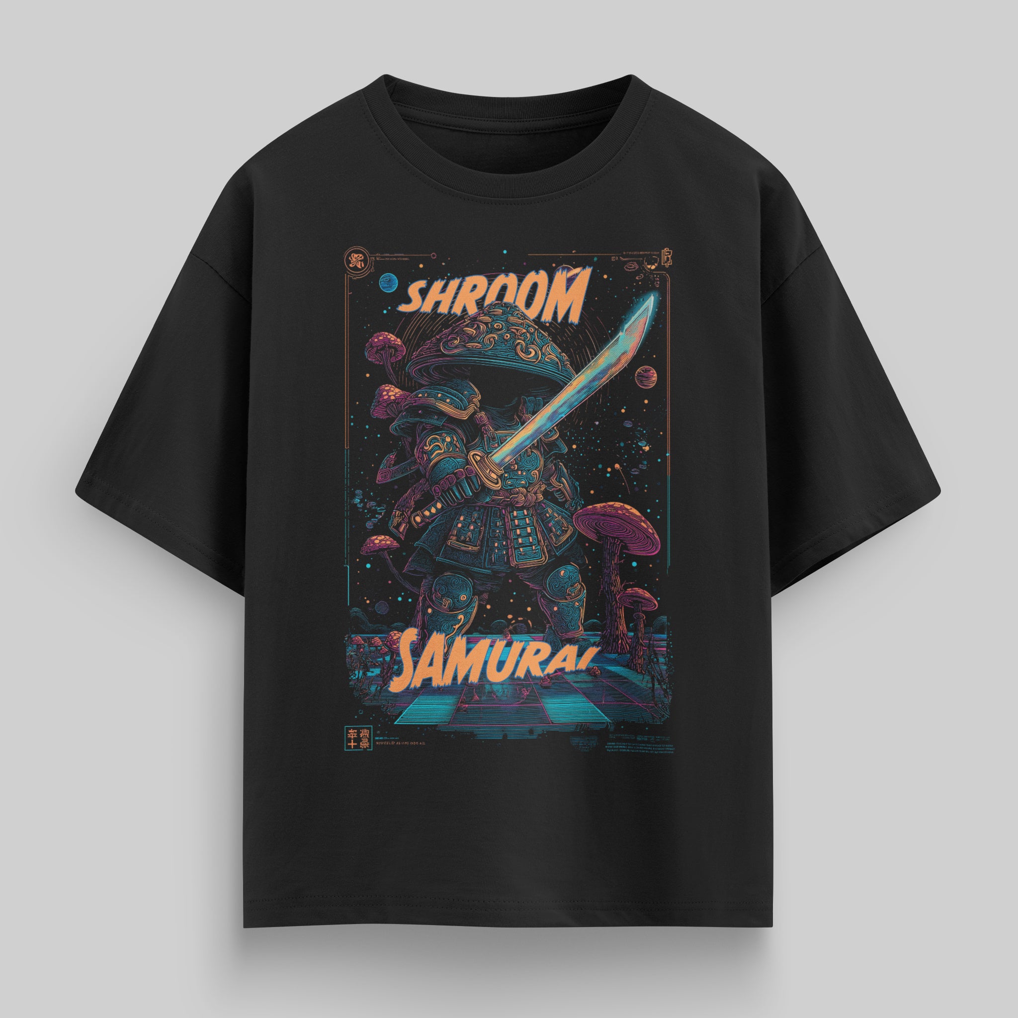 Shroom Samurai cuts through the void with a blade forged in neon chaos. Draped in ancient armor and crowned with a cosmic mushroom helm, this warrior stands between worlds—half mystic, half mercenary, all vengeance. A psychedelic collision of sci-fi and tradition, this tee turns battlefields into dreamscapes.