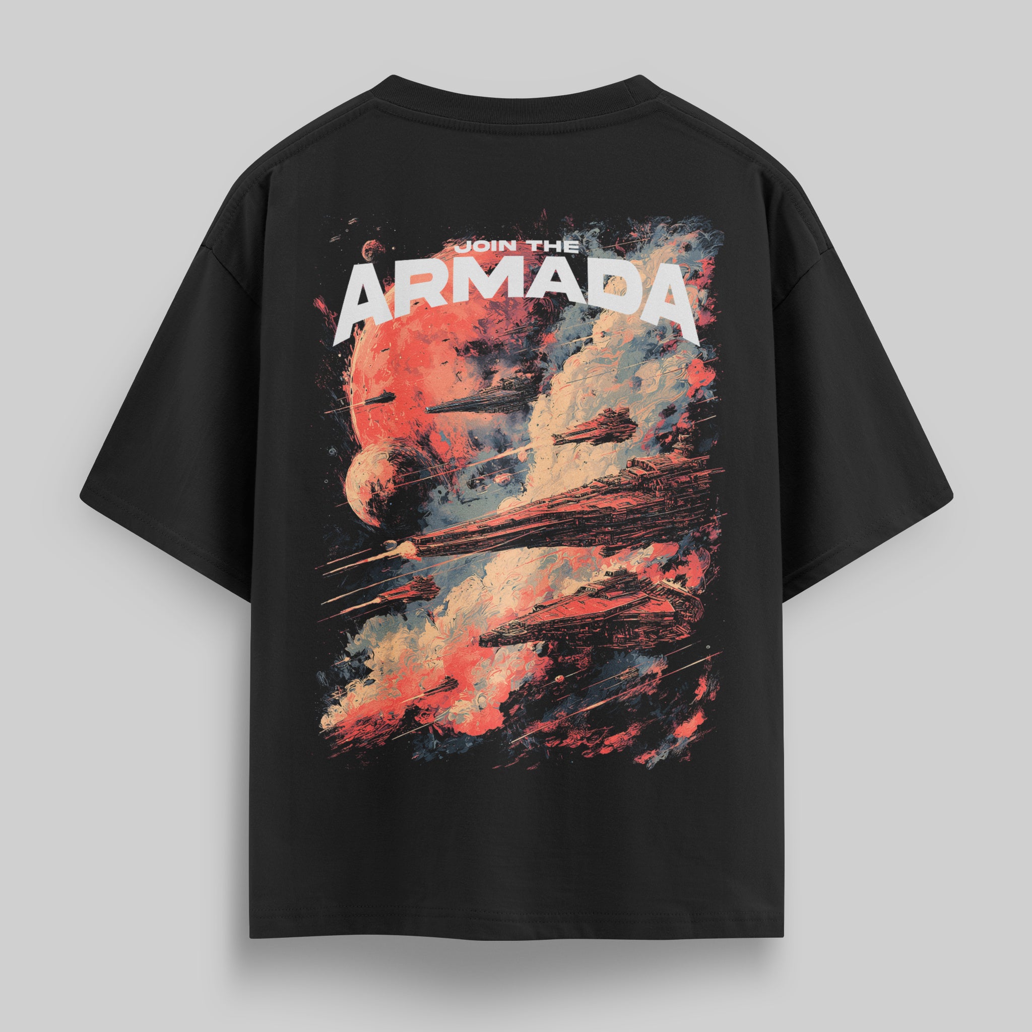 The galaxy doesn’t wait—you enlist or get left behind. “Join the Armada” throws you into a cosmic battlefield where star destroyers cut through nebula firestorms and loyalty is written in starlight. A call-to-arms disguised as streetwear, this tee feels like a vintage recruitment poster for a war that never ends—and maybe never should.